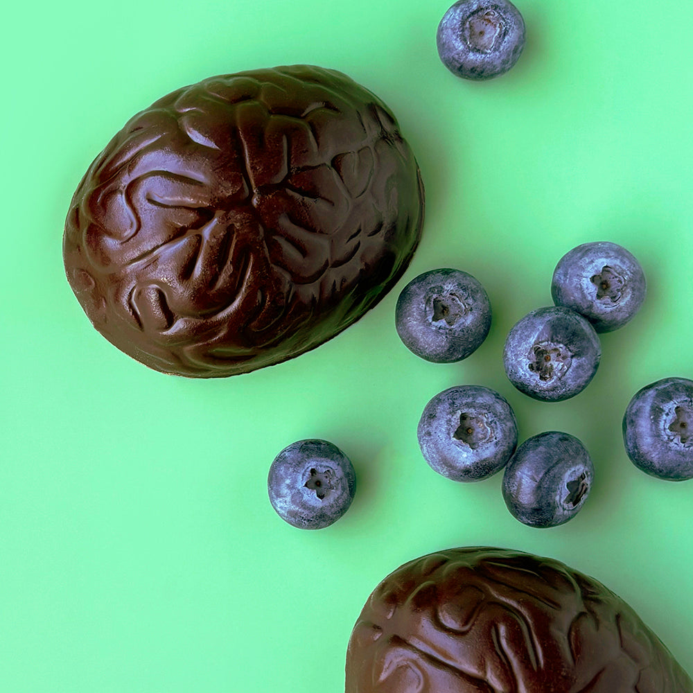 Our Chocolate Brains are made with Rich Dark Chocolate and Dried Newfoundland Blueberries, in recognition of Brain Awareness Week. Ingredients: dark chocolate (cocoa mass, sugar, cocoa butter, soya lecithin, natural vanilla flavouring), blue berries (blueberries, sugar, sunflower oil), natural blueberry oil. May contain: peanuts, tree nuts, eggs, wheat.