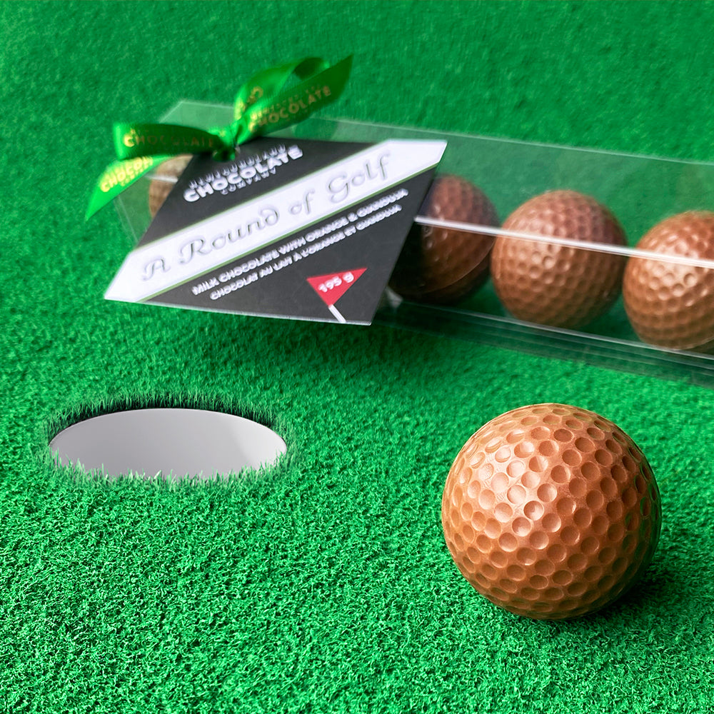 For the golf and chocolate lover in your life, treat them to this delicious "Round of Golf" with milk chocolate, orange and gianduja golf balls.