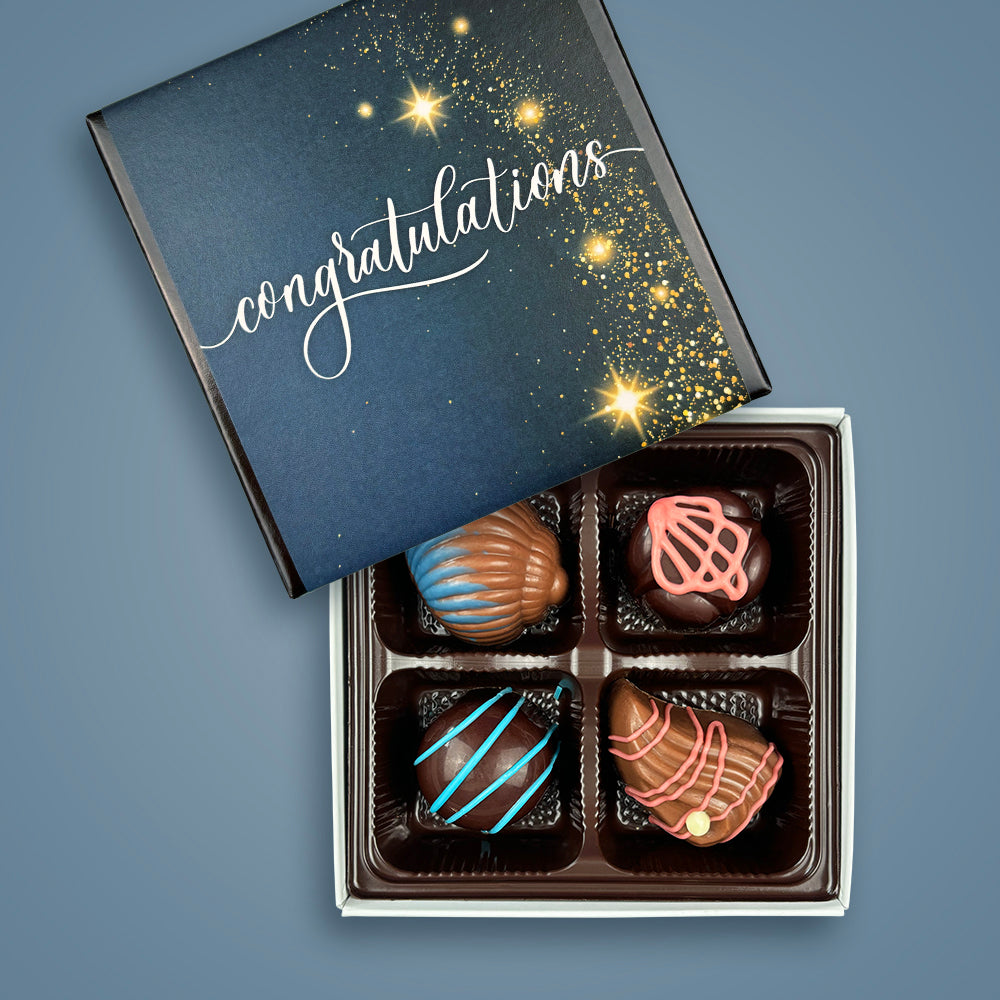 EXPRESS YOUR CHEER AND BEST WISHES IN THE SWEETEST OF WAYS WITH OUR CONGRATULATIONS 4 PIECE BOX OF CHOCOLATES.