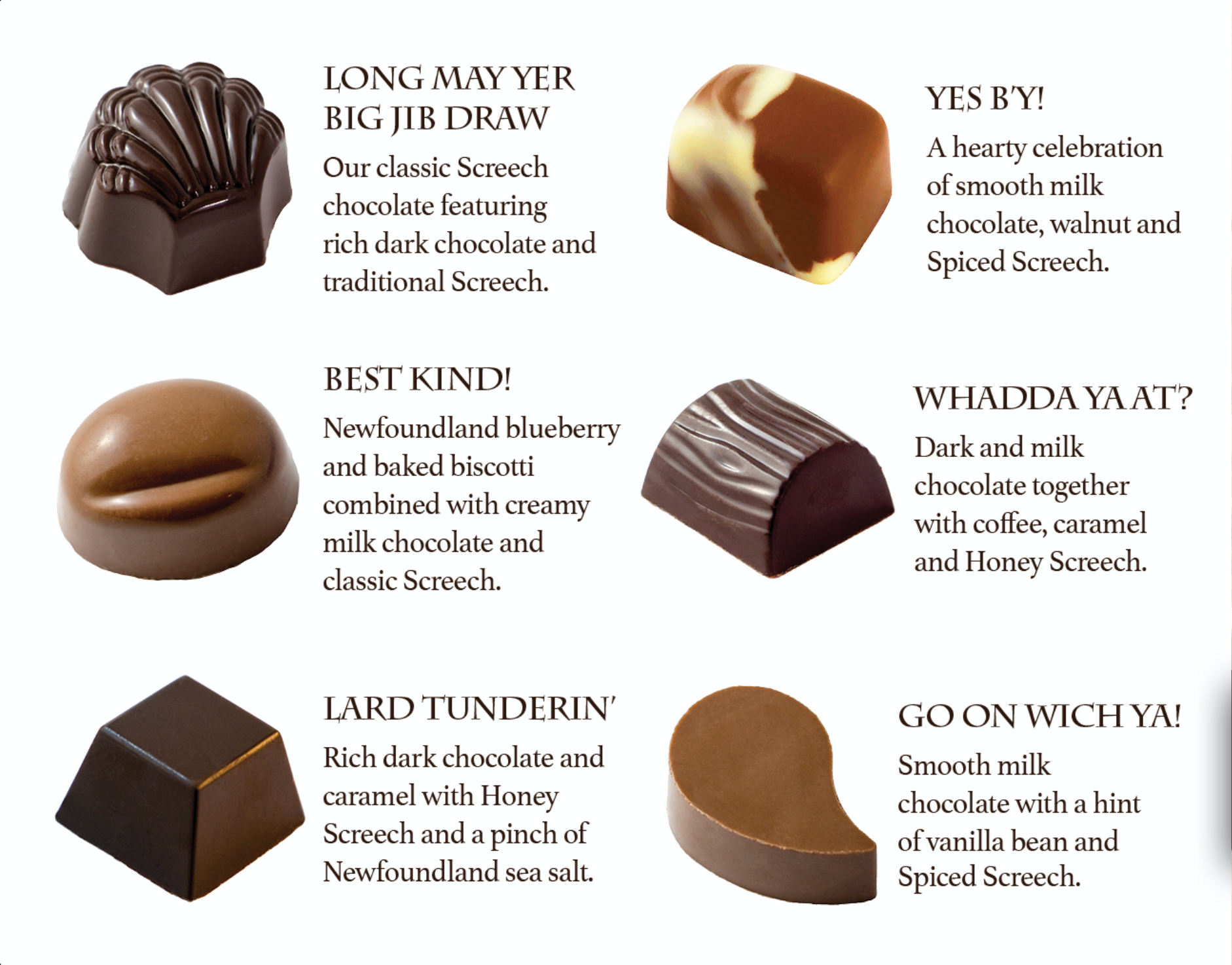 Our signature six piece box of milk and dark chocolates featuring Newfoundland's own Screech Rum.