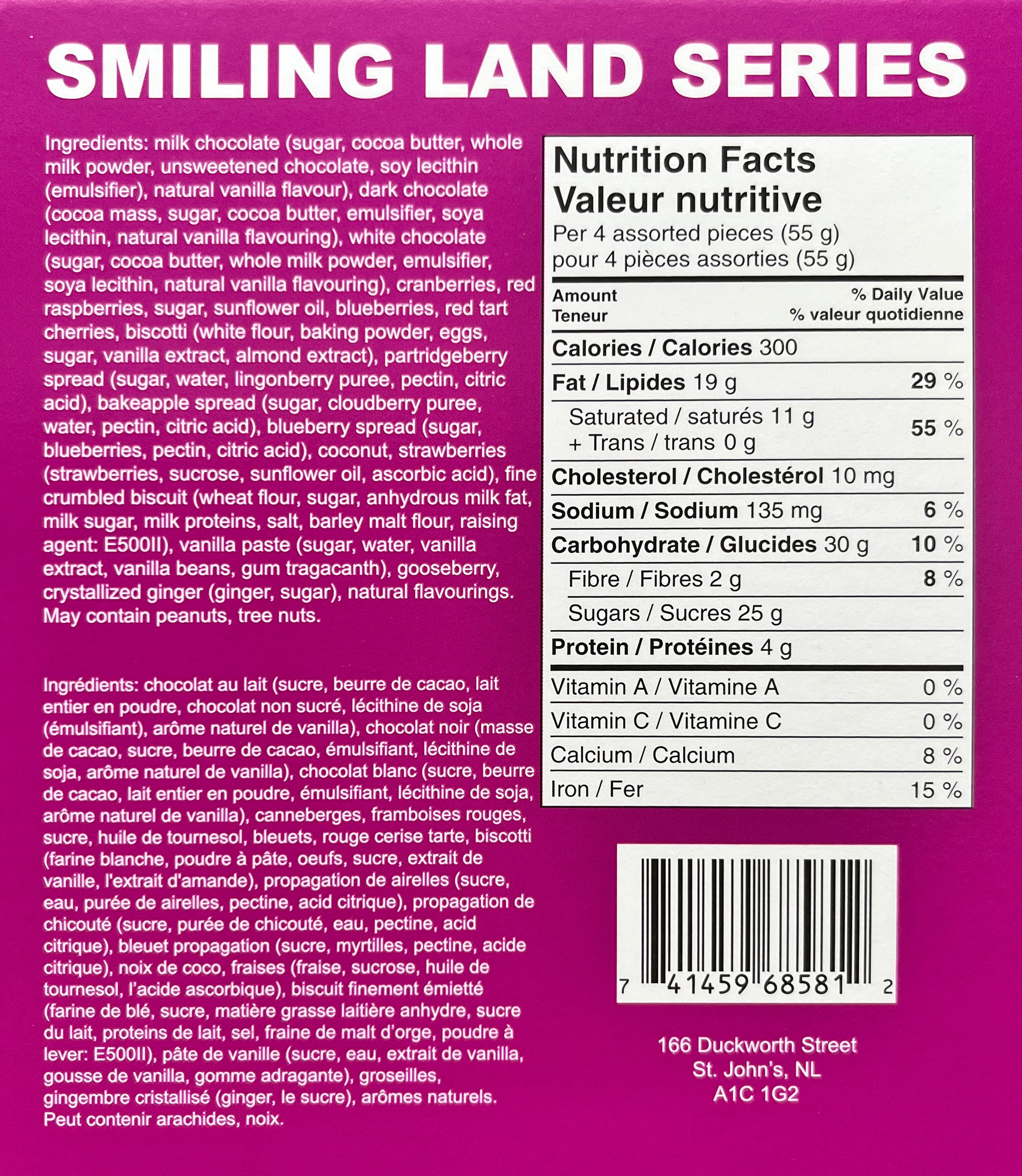 The Smiling Land Series features our very finest berry chocolate selection with an assortment of milk, dark and some white chocolates. Each chocolate is artisan crafted using pure, simple and delicious local ingredients.